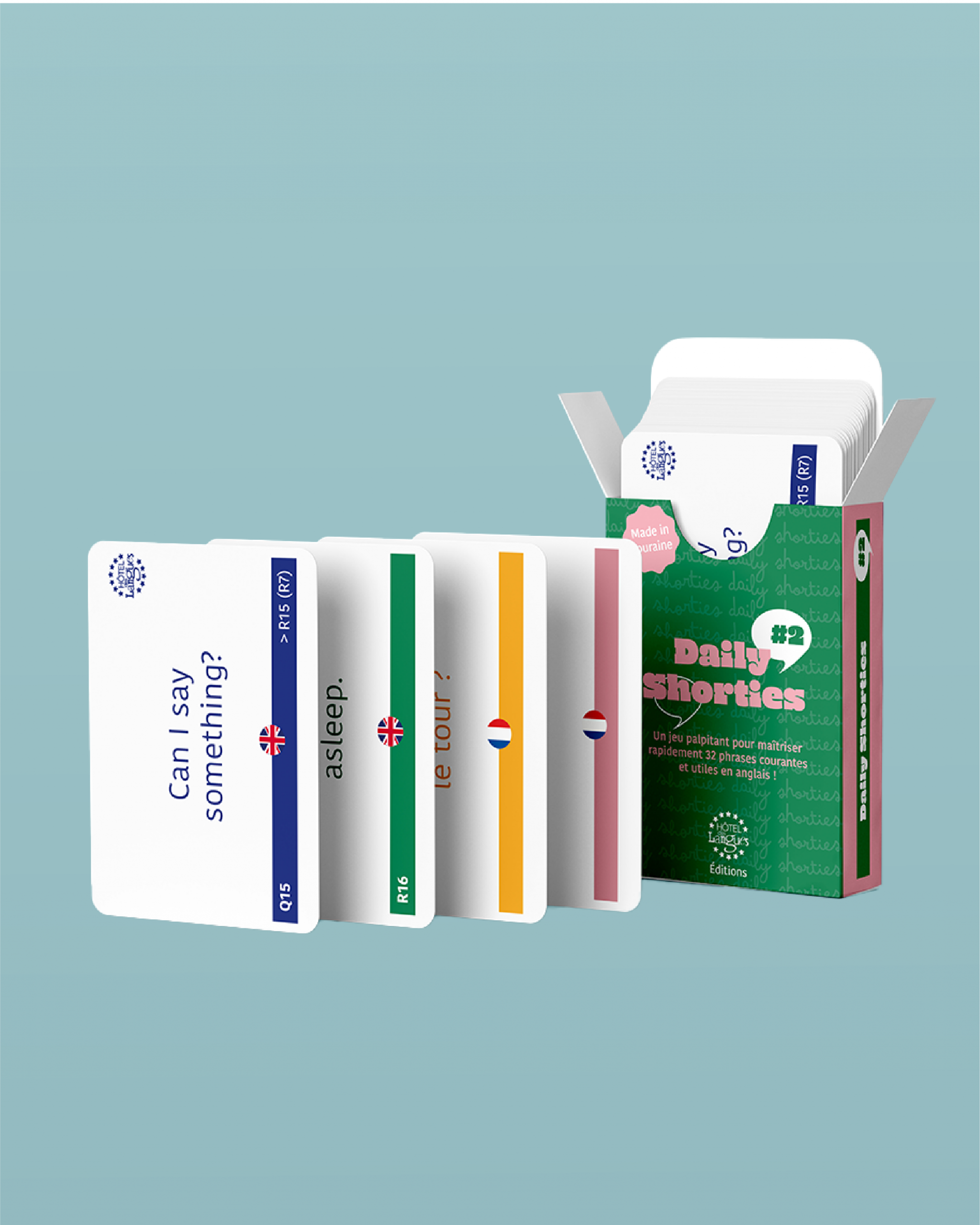 Les Daily Shorties c’est 32 cartes de jeux proposant des phrases courantes et utiles en anglais, traduites en français, qui comprennent deux jeux en un :